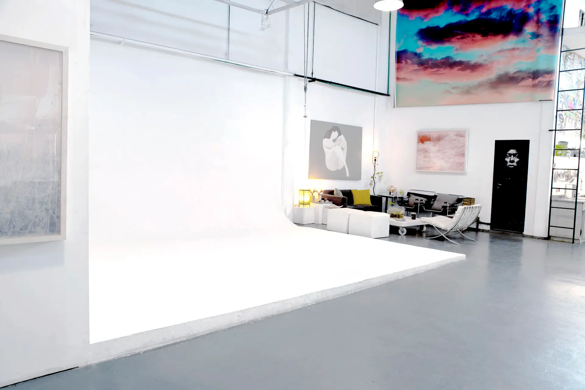 El estudio cuenta con un fondo infinito blanco de 6,5 x 4,5 metros, con un tiro útil de hasta 15 metros, ideal para producciones audiovisuales, fotografía, desfiles o montaje de escenografías.